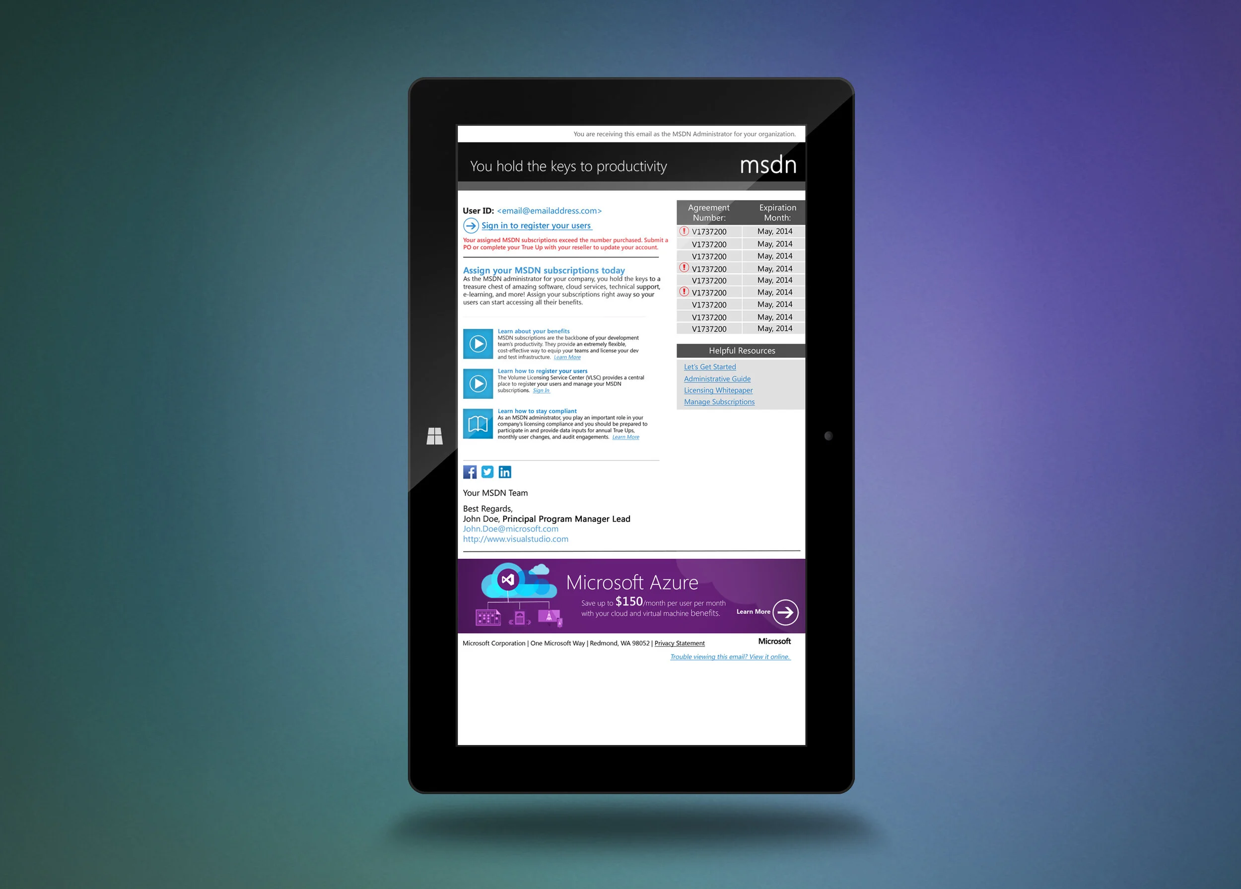 Contracted through The Red Door Collaborative our objective was to design email templates as part of a relational marketing campaign for Microsoft's Visual Studio "msdn." Visual Studio's msdn is software which allows designers and developers to understand each other in order to create applications. It connects ideas, devices and people around the world. Inside this environment teams can not only create applications, but test their creations in virtual real world scenarios. Microsoft needed to maintain an ongoing relationship with their customers using this software. The goals for the design was to provide the reader with: an account status update, educational resources and promotional sale opportunities. This email would allow the user to keep a healthy account status and use their product to it's greatest potential. We maintained brand continuity and kept the design clean and structured in an effort to create a four second digestion rate.
